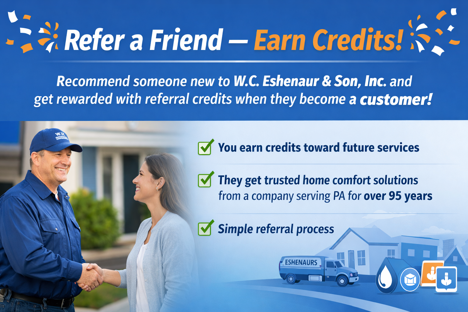 As a valued customer of W.C. Eshenaur & Son, Inc., you can earn referral credits when you recommend a friend, neighbor, or family member to us. When your referral becomes a new customer and completes service, you’ll receive credits toward future services — it’s our way of saying thank you for your trust and loyalty.